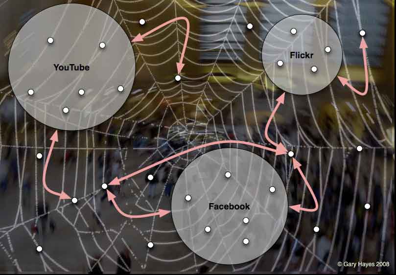 The addition of three example web 2.0 components of video and photo sharing plus combination social network shows how a flocking occurs as well as more interconnectivity stimulated through those portals. Obviously the components would be interconnected and overlap etc: