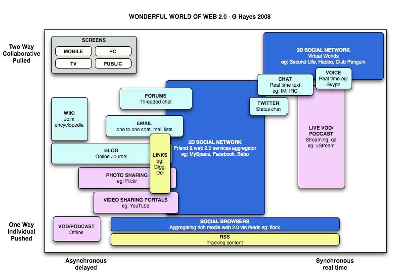 The first diagram above shows the components of web 2.0 with axes of synch/asynch on the horizontal and one to many and many to many on the vertical axis – all of the components can be delivered to the four screens indicated on the top left. It is primarily intended to show that the blue (text/conversation) and purple (richer media) web 2.0 components are often combined to create a well rounded social network portal. The yellow blocks are messengers, digg and rss which act as glue and navigation.